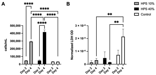 In the first series of experiments, we sought to examine the effects of HPS stimulation with regard to proliferation, viability and cytotoxicity of human osteoblasts. With the use of a fully automated cell counter, we determined the proliferative effects of two different HPS concentrations (10% and 40%) after 2 and 4 days of stimulation. Here, we found up to 1.4× increase in cell number on day 2 and up to 14.2× increase on day 4 with HPS-40% stimulation compared to controls (Figure 1A). Human osteoblast cell number observed with HPS-40% stimulation was also significantly higher than HPS-10% on day 4 (p < 0.0001), indicating a dose-dependent proliferative promotion by HPS. Moreover, both HPS-10% and HPS-40% stimulation resulted time-dependently in a higher osteoblast proliferation with longer HPS stimulation (2 days vs. 4 days; p < 0.0001). In the next step, we determined cell cytotoxic effects of HPS stimulation by LDH assay. Here, very low values of LDH (normalized per cell) were detected in all conditions with HPS stimulation (Figure 1B), specifically LDH release was comparable to the control group at day 2. Interestingly, cytotoxicity did not appear to increase at day 4 in the HPS groups, since LDH was significantly lower in both HPS-10% and HPS-40% compared to controls (p = 0.009 and p = 0.005 respectively).