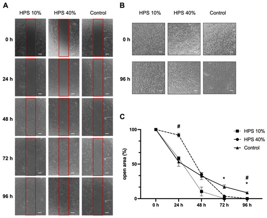Osteoblast migration is one of the key steps of the bone formation process and fracture repair [36,37]. Therefore, we assessed the migration of osteoblasts using a scratch assay by monitoring a denuded open area (in vitro fracture model) with HPS-10% and HPS-40% application compared to controls (Figure 2A). Interestingly, we observed a slower migration of osteoblasts after 24 h with higher concentration (HPS-40%) than HPS-10% (open area: 92 ± 2.7% vs. 58 ± 2.7%, p = 0.002) and controls (open area: 92 ± 2.7% vs. 53 ± 6.5%, p = 0.03). Nonetheless, with longer culture duration, HPS-10% and HPS-40% accelerated closure of the open area more rapidly, particularly HPS-10%, which resulted in significantly smaller open area after 72 h compared to controls (0.2 ± 0.03% vs. 17.2 ± 2.60%, p = 0.04) and HPS-40% (0.2 ± 0.03% vs. 3.5 ± 0.35%, p = 0.02). HPS-40%-treated osteoblasts reached a significantly smaller open area after 96 h compared to controls (0.03 ± 0.03% vs. 8.50 ± 1.22%, p = 0.04). In summary, the open area closed the fastest with HPS-10% stimulation after 72 h, whereas controls did not appear to close even after 96 h. Furthermore, we discovered dose-dependent effects between HPS-10% and HPS-40%, which places HPS-10% favorably with regard to cell migration over a 96 h time frame (p = 0.002) (Figure 2C). Interestingly, in terms of cell morphology, we found that both HPS-10% and HPS-40%-treated osteoblasts started to turn from cuboid-shaped into elongated/spindle-shaped cells after 24 h, this change became more apparent after 96 h, whereas controls were mostly dominated by cuboid-shaped osteoblasts after 96 h (Figure 2B).