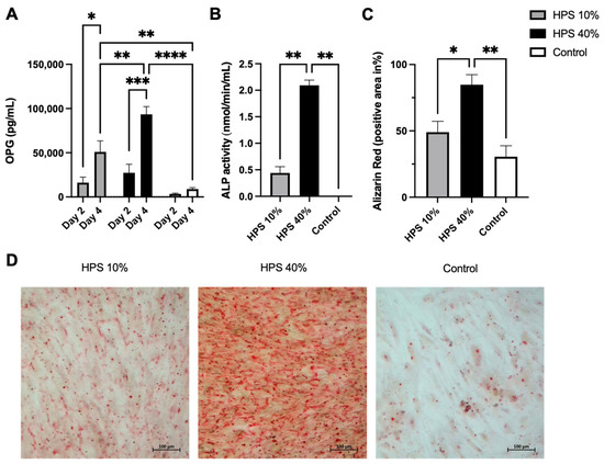 In the final step, we investigated alkaline phosphatase (ALP) enzyme activity to determine the ossification capacity of HPS-stimulated human osteoblasts. It has to be noted that ALP is primarily expressed in matured osteoblasts [42]. Here, ALP was increasingly enhanced after 4 days of HPS stimulation (Figure 3B) which may indicate a higher differentiation of osteoblasts. HPS-40% stimulated osteoblasts displayed notably higher ALP activity than HPS-10% (2.09 vs. 0.44, p = 0.004) and controls (2.09 vs. 0.002, p = 0.004). To verify this result, we investigated levels of mineralized calcium nodule formation by Alizarin red staining. We used the same experimental setting from above and stained 4 days of HPS-stimulated osteoblasts and controls. Digital photographs were taken (Figure 3D) and analyzed by image analysis. Here, we demonstrate that ALP-activity correlates to the degree of calcium deposits in the same dose-dependent manner (Figure 3C). HPS-40% stimulated osteoblasts produced 2.8× more calcium nodules in comparison to HPS-10% (p = 0.04) and controls (p = 0.007). Therefore, HPS may promote ossification in a dose-dependent manner through ALP upregulation in human osteoblasts.