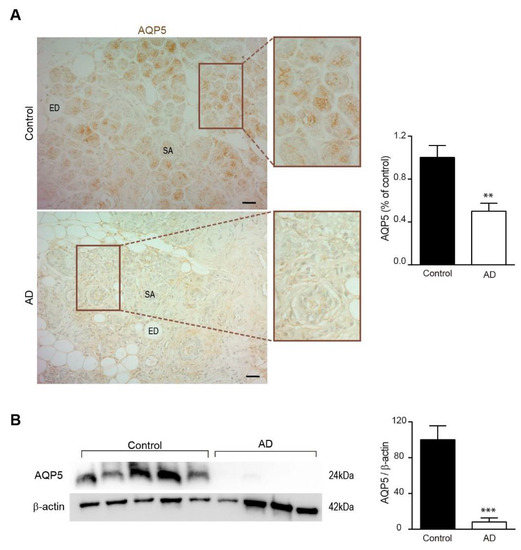 - Azlina, A.; Li, X.; Javkhlan, P.; Hasegawa, T.; Yao, C.; Akamatsu, T.; Hosoi, K. Down-regulation of submandibular gland AQP5 following parasympathetic denervation in rats. J. Med. Investig. 2009, 56, 273–276. [Google Scholar] [CrossRef][Green Version]