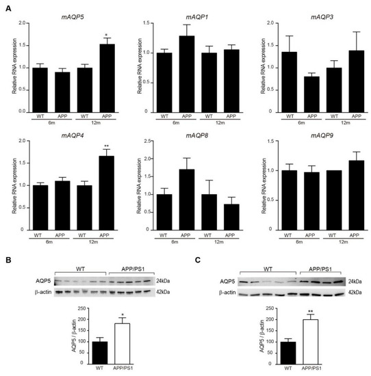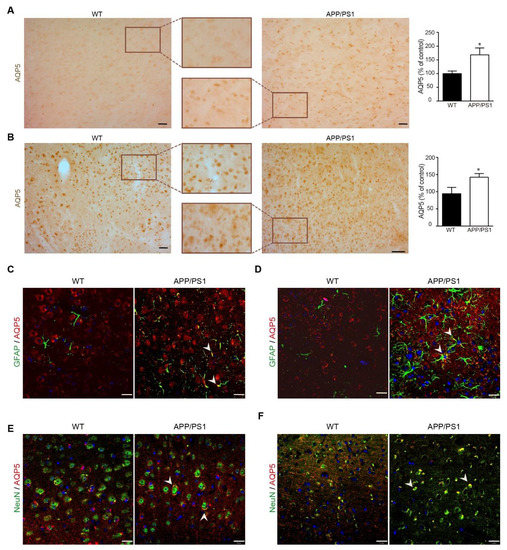 - Misawa, T.; Arima, K.; Mizusawa, H.; Satoh, J. Close association of water channel AQP1 with amyloid-beta deposition in Alzheimer disease brains. Acta Neuropathol. 2008, 116, 247–260. [Google Scholar] [CrossRef]
