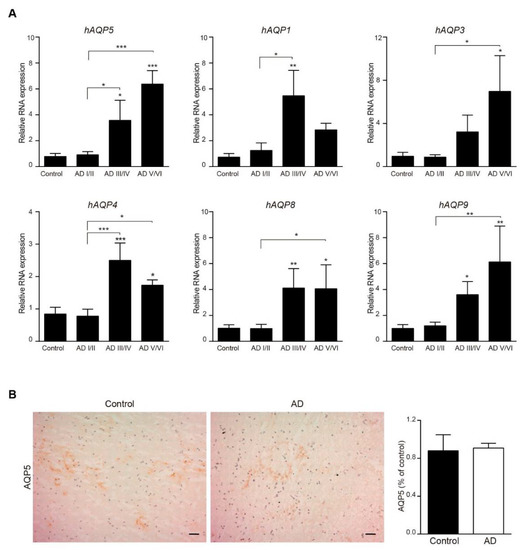 - Pérez, E.; Barrachina, M.; Rodríguez, A.; Torrejón-Escribano, B.; Boada, M.; Hernández, I.; Sánchez, M.; Ferrer, I. Aquaporin expression in the cerebral cortex is increased at early stages of Alzheimer disease. Brain Res. 2007, 1128, 164–174. [Google Scholar] [CrossRef]