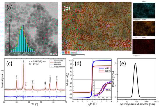 (a) TEM images of Zn0.4Fe2.6O4 NPs. Inset represents the size distribution histogram of Zn0.4Fe2.6O4 NPs fitted to a log-normal distribution (orange line). (b) EDX global chemical map together with chemical maps of Fe, Zn, and O elements of Zn0.4Fe2.6O4 NPs. (c) XRD diffraction pattern of Zn0.4Fe2.6O4 NPs. (d) Hysteresis loops of Zn0.4Fe2.6O4 NPs acquired at 4 K and 300 K. Inset represents the low-field regime of hysteresis loops. (e) Hydrodynamic diameter resulted from DLS measurements of Zn0.4Fe2.6O4 NPs dispersed in water at a concentration of 10 μgMNPs/mL.