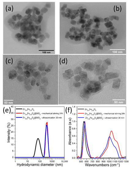TEM images of Zn0.4Fe2.6O4@SiO2-W clusters made via w/o microemulsion using (a,b) mechanical stirring for 24 h and (c,d) ultrasonication for 30 min. (e) Hydrodynamic diameter resulted from DLS measurements of uncoated Zn0.4Fe2.6O4 and Zn0.4Fe2.6O4@SiO2-W clusters dispersed in water at a concentration of 10 μgMNPs/mL. (f) FT-IR spectra of uncoated Zn0.4Fe2.6O4 and Zn0.4Fe2.6O4@SiO2-W clusters. The spectra are normalized to the highest absorption band.