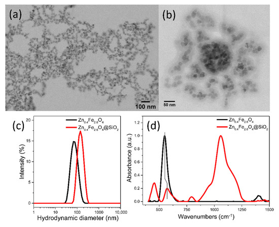 The classical coating method consisting of mechanical stirring over 24 h of a w/o (reverse) microemulsion has been firstly applied to encapsulate the hydrophobic Zn0.4Fe2.6O4 clusters in a silica shell. This sample also represents a reference for the present study. As seen in the TEM images of Figure 2a,b, clusters of several tens of MNPs are encapsulated in a thin silica shell and denoted Zn0.4Fe2.6O4@SiO2-W. The mean hydrodynamic diameter of the resulted Zn0.4Fe2.6O4@SiO2 clusters increased considerably to 400 nm with respect to that of uncoated Zn0.4Fe2.6O4 NPs (Figure 2e). As evidenced by FT-IR spectroscopy, the absorption band originated from the Fe-O bond dominates the spectra, and it is slightly deviated to 566 cm−1 (compared to 549 cm−1 for uncoated Zn0.4Fe2.6O4) due to the attachment of SiO2 to the NP’s surface (Figure 2f). The wide absorption band located at 1039 cm−1, due to the stretching vibration of the Si-O-Si bond, proves the presence of the thin layer of SiO2 around the Zn0.4Fe2.6O4 clusters (red curve in Figure 2f) [37].