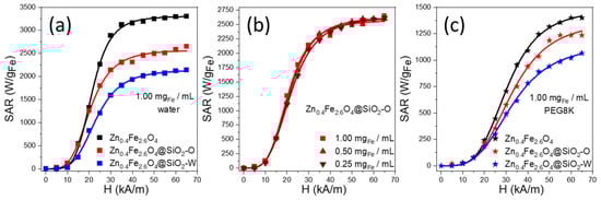 Field dependence of Specific Absorption Rate (SAR) for (a) Zn0.4Fe2.6O4, Zn0.4Fe2.6O4@SiO2-W, and Zn0.4Fe2.6O4@SiO2-O clusters dispersed in water at 1.00 mgFe/mL; (b) Zn0.4Fe2.6O4@SiO2-O clusters dispersed in water at 1.00, 0.50, and 0.25 mgFe/mL; (c) Zn0.4Fe2.6O4, Zn0.4Fe2.6O4@SiO2-W, and Zn0.4Fe2.6O4@SiO2-O clusters dispersed in PEG8K at 1.00 mgFe/mL. Curves represent the fits with the logistic function (Section S2).
