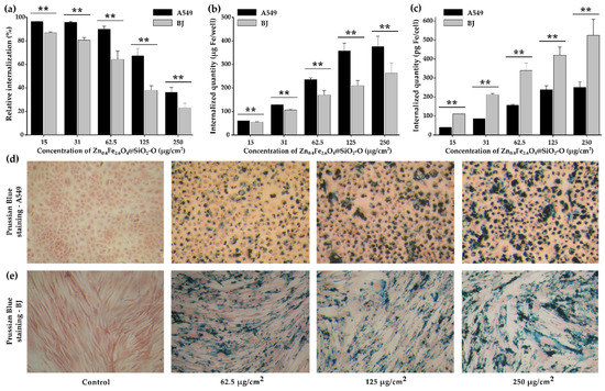 Cellular internalization of Zn0.4Fe2.6O4@SiO2-O clusters in A549 and BJ cells after a 24 h exposure: (a) the relative internalization and (b) total iron amount per well and per cell. (c) total iron amount per cell. Prussian Blue staining of (d) A549 and (e) cells exposed for 24 h to Zn0.4Fe2.6O4@SiO2-O clusters. Values are expressed as mean ± SD of three biological replicates. Double asterisks (**) indicate a significant difference with p values < 0.001 (ANOVA + Dunn’s).