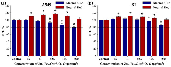 Cytocompatibility of Zn0.4Fe2.6O4@SiO2-O clusters on (a) A549 and (b) BJ cell line after a 24 h exposure. Data are presented as relative fluorescence units (RFU) as compared to the negative control (100%), as mean ± SD of three biological replicates. The significant differences compared to the negative control (ANOVA + Dunn’s; p < 0.05) are noted with asterisks (*).