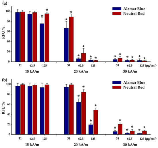 Cytotoxic effects of internalized Zn0.4Fe2.6O4@SiO2-O clusters in (a) A549 and (b) BJ cells were evaluated after a 30 min exposure to AMF of 355 kHz and amplitudes of 15, 20, and 30 kA/m. Cellular viability was measured using Alamar Blue and Neutral Red assays and presented as the mean ± SD of three biological replicates. Data are presented as relative values to AMF negative control (100%). The significant differences compared to the negative control (ANOVA + Dunn’s; p < 0.05) are marked with asterisks (*).