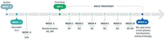 An adeno-associated virus (AAV) construct AAV8-TBG-m-Ren1d (F61R/P65S, Vector Biolabs, Malvern, PA), expressed under the control of the liver-specific thyroxin-binding globulin promotor [,], was used to induce hypertension [,]. ReninAAV (2 × 1010 genome copies, GC) was suspended in sterile PBS and administered by tail vein injection in conscious animals (6 weeks of age). One week after AAV injection, UNx was performed as described previously [,], see Figure 1. Animals were allowed to recover for 6 weeks before study start (defined as Day 0). Body weight was measured twice a week from one week before AAV administration until study start, thereafter once daily.