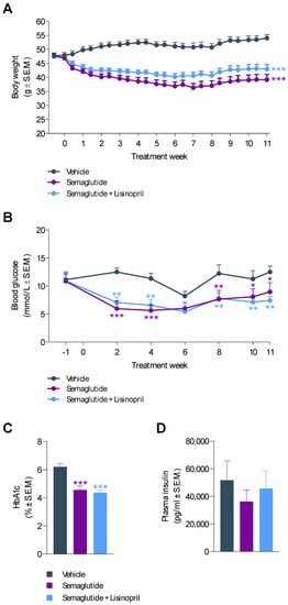 Compared to baseline, a sustained weight loss was observed after 11 weeks of semaglutide (−16.2 ± 3.0%) and semaglutide + lisinopril (−8.2 ± 3.5%) treatment in db/db UNx-ReninAAV mice (Figure 2A). The slower decline in body weight with semaglutide + lisinopril treatment did not attain statistical significance when compared to semaglutide monotherapy (p = 0.126). In contrast, vehicle controls showed progressive weight gain over the entire course of the study compared to baseline (13.8 ± 2.5%, p < 0.001) (Figure 2A). Semaglutide and semaglutide + lisinopril improved hyperglycemia to a similar extent, being sustained after two weeks of treatment (Figure 2B). Improved glycemic control was further supported by significantly lowered HbA1c levels following long-term semaglutide and semaglutide + lisinopril treatment, respectively (Figure 2C). Treatments had no effect on terminal fed insulin levels (Figure 2D).