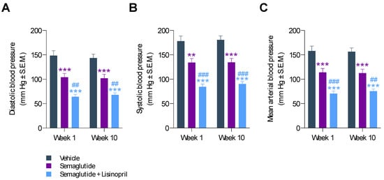 Blood pressure was monitored after 1 and 10 weeks of treatment. Compared to vehicle controls, semaglutide significantly reduced hypertension in db/db UNx-ReninAAV mice. After 1 week of treatment, semaglutide reduced both diastolic (104 ± 8 mm Hg vs. 148 ± 9 mm Hg, p < 0.001, Figure 3A) and systolic blood pressure (134 ± 8 mm Hg vs. 178 ± 10 mm Hg, p < 0.01, Figure 3B). The antihypertensive effect of semaglutide was sustained over the entire treatment period, as indicated by similar nominal reductions in diastolic (102 ± 8 mm Hg vs. 144 ± 7 mm Hg, p < 0.001) and systolic blood pressure (135 ± 8 mm Hg vs. 181 ± 8 mm Hg, p < 0.001) after 10 weeks of treatment (Figure 3A,B). Correspondingly, similar reductions in mean arterial blood pressure were observed (Figure 3C). When combined with lisinopril administration, this led to further improvements in diastolic (week 1, 64 ± 5 mm Hg, p < 0.001 vs. vehicle; p < 0.01 vs. semaglutide; week 10, 68 ± 4 mm Hg, p < 0.001 vs. vehicle; p < 0.01 vs. semaglutide), systolic (week 1, 84 ± 6 mm Hg, p < 0.001 vs. vehicle, p < 0.001 vs. semaglutide; week 10, 90 ± 5 mm Hg, p < 0.001 vs. vehicle, p < 0.001 vs. semaglutide) and mean arterial blood pressure (week 1, 71 ± 5 mm Hg, p < 0.001 vs. vehicle, p < 0.001 vs. semaglutide; week 10, 76 ± 5 mm Hg, p < 0.001 vs. vehicle, p < 0.01 vs. semaglutide).