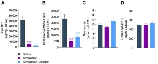 Semaglutide treatment for 11 weeks substantially improved urinary biomarkers of renal function in db/db UNx-ReninAAV mice. Compared to vehicle controls, severe albuminuria was markedly reduced by semaglutide (albumin-to-creatine ratio (ACR); 5417 ± 1825 vs. 51,573 ± 7669 µg/mg, p < 0.001), see Figure 4A and Figure S1. Correspondingly, KIM-1-to-creatine ratio was also markedly lowered by semaglutide treatment (5223 ± 738 vs. 23,474 ± 3517 µg/mg, p < 0.001, Figure 4A and Figure S1). While co-administration of lisinopril further reduced ACR (1143 ± 188 µg/mg, p < 0.001 vs. vehicle control, Figure 4A), this effect was not significantly greater compared to semaglutide alone (p = 0.536). Semaglutide + lisinopril reduced KIM-1-to-creatine ratio (8540 ± 2487 µg/mg, p < 0.001 vs. vehicle control) to a similar extent as semaglutide monotherapy (Figure 4B). Plasma urea and cystatin C levels were unaffected by treatments (Figure 4C,D).