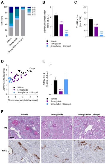 A deep-learning-based imaging method was applied for automated detection of glomeruli and scoring of glomerulosclerosis []. Glomeruli were classified according to a five-point scale, i.e., GS0 (normal), GS1 (mild, sclerotic area up to 25%), GS2 (moderate, sclerotic area of 25–50%), GS3 (severe, sclerotic area of 51–75%), and GS4 (global, sclerotic area of 76–100%). Groupwise distribution of glomerulosclerosis scores is shown in Figure 5A. Vehicle-dosed animals displayed a substantial fraction of glomeruli with severe (G3) or global (G4) glomerulosclerosis. Notably, semaglutide reduced the overall degree of glomerular injury, expressed as significantly lowered glomerulosclerosis index (1.2 ± 0.2 vs. 2.1 ± 0.2, p < 0.001, Figure 5A) and fraction of glomeruli exhibiting severe or global sclerotic damage (GS3 + GS4, 32 ± 5 vs. 57 ± 6, p < 0.001, Figure 5C). The glomeruloprotective effect was even more pronounced when semaglutide was combined with lisinopril (Figure 5B). As for semaglutide alone, the improvements were particularly driven by a reduction in the fraction of glomeruli with severe or global glomerulosclerosis score following semaglutide + lisinopril treatment (Figure 5C). Lowered glomerulosclerosis index significantly correlated with reduced albuminuria (r2 = 0.54, p < 0.001, Figure 5D). Quantitative histological analysis of KIM-1 positive staining showed significantly decreased KIM-1 proportional area in the semaglutide-treated group compared to vehicle controls (0.3 ± 0.1 vs. 1.4 ± 0.4%, p < 0.001), while no significant difference was observed with combined semaglutide + lisinopril treatment (1.5 ± 0.7, p > 0.05), see Figure 5E. Representative images of glomerulosclerosis pathology visualized with a PAS staining and KIM-1 immunohistochemistry is shown in Figure 5F.