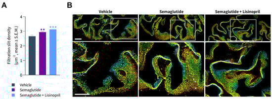 FSD was assessed using synaptopodin (a foot process actin-associated protein) and podocin (a raft-associated component of the glomerular slit diaphragm) as markers of phenotypic maturity of podocytes. Rarefication of foot processes was evident in db/db UNx-ReninAAV mice (Figure 6A). Compared to vehicle controls, effacement of foot processes was less prominent in semaglutide-treated db/db UNx-ReninAAV mice. Accordingly, semaglutide significantly increased FSD in db/db UNx-ReninAAV mice (p < 0.01 vs. vehicle control, Figure 6A,B). db/db UNx-ReninAAV mice receiving combined semaglutide and lisinopril treatment predominantly demonstrated perfectly formed foot processes and some areas with low effacement and, rarely, high effacement. In accordance, semaglutide + lisinopril further increased FSD compared to vehicle controls (p < 0.001, Figure 6A,B), however, this was not statistically significant compared to semaglutide alone (p = 0.08).