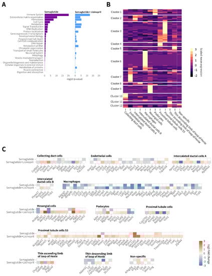 Semaglutide suppresses gene expression markers of extracellular matrix remodelling and immune system activation in db/db UNx-ReninAAV mice. (A) Enriched Reactome pathways following semaglutide (30 nmol/kg, s.c., q.d. n = 7) and semaglutide (30 nmol/kg, s.c., q.d.) + lisinopril (30 mg/kg, p.o., n = 7) treatment compared to corresponding vehicle-dosed db/db UNx-ReninAAV mice (n = 7). (B) Deconvolution of differentially expressed genes (DEGs) according to major kidney cell type. Bright yellow color in heatmap denotes cluster of genes expressed with relative high cell specificity. (C) Heatmaps illustrating expression changes in individual DEGs grouped according to major cell type expressing the corresponding gene. Data are expressed relative to vehicle-dosed controls. Color gradients indicate significantly upregulated (red color) or downregulated (blue color) gene expression (log2-fold change, false discovery rate (FDR) < 0.05). All DEGs are listed in Table S1. Bulk RNA sequencing data are accessible using a web-based global gene expression data view-er [Gubra Gene Expression Experience (GGEX), https://rnaseq.gubra.dk/, accessed on 3 July 2022].