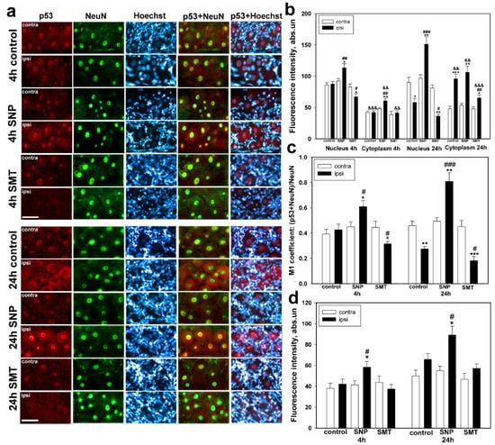 Immune-fluorescent microscopy. (a) Expression of p53 (red fluorescence) in DRG neurons of rats of the control group, which were treated with physiological solution, and the experimental group, which were treated with either the NO donor (SNP) or the iNOS selective inhibitor (SMT), 4 h and 24 h after sciatic-nerve transection. The scale section is 50 μm. (b) The dependence of mean p53 fluorescence intensity in the nuclei and cytoplasm of neurons of the contralateral and ipsilateral DRG of the control and experimental groups of animals 4 h and 24 h after sciatic-nerve transection. (c) The M1 coefficient of colocalization of p53 and the NeuN neuronal nuclei marker in the contralateral and ipsilateral DRGs of the control and experimental groups of animals 4 h and 24 h after sciatic-nerve transection. (d) The dependence of mean p53 fluorescence intensity in glial cell nuclei of DRGs 4 h and 24 h after sciatic-nerve transection. Ipsi—the axotomized ipsilateral ganglion; contra—the contralateral ganglion; NeuN—neuronal nuclei marker (green fluorescence); NeuN+p53 and Hoechst+p53—overlap; Hoechst—the fluorescence of Hoechst 33,342, which allows visualization of nuclei of both neurons and glial cells. One-way ANOVA. Mean ± SEM. n = 6. * p < 0.05, ** p < 0.01, *** p < 0.001—ipsilateral DRG with respect to the contralateral DRG of the same animal; # p < 0.05, ## p < 0.01, ### p < 0.001—ipsilateral DRG with respect to the ipsilateral DRG of the control group animal within the framework of the same time interval after axotomy; && p < 0.01, &&& p < 0.001—ipsilateral DRG with respect to the ipsilateral DRG of the same animal.