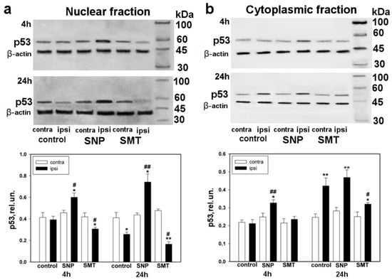 Western blot analysis confirmed the data of the immune-fluorescent microscopy. For example, it was found out that the level of p53 was increased in the nuclear fraction 4 h after axotomy and was even more increased 24 h after axotomy in the ipsilateral ganglia of rats treated with SNP in comparison with the contralateral DGRs of the experimental group (one-way ANOVA with a Dunnett’s post hoc test, p < 0.05, F1,10 = 9.701, Shapiro–Wilk test p = 0.128, Brown–Forsythe test p = 0.532 and Kruskal–Wallis H-test, p < 0.05, Shapiro–Wilka test p < 0.05, respectively) and the ipsilateral ganglia of the control group (one-way ANOVA with a Dunnett’s post hoc test, p < 0.05, F1,10 = 16.098, Shapiro–Wilk test p = 0.767, Brown–Forsythe test p = 0.819 and Kruskal–Wallis H-test, Shapiro–Wilk test p < 0.01, respectively) (Figure 2a). The opposite dynamics was observed in the presence of SMT, the selective inhibitor of iNOS. It was shown that in the control group the level of p53 decreased by almost two times in the nuclear fraction of axotomized DRG, 24 h after axotomy, in comparison with the opposite undamaged ganglion (one-way ANOVA with a Dunnett’s post hoc test, p < 0.05, F1,10 = 8.058, Shapiro–Wilk test p = 0.117, Brown–Forsythe test p = 0.254) (Figure 2a).