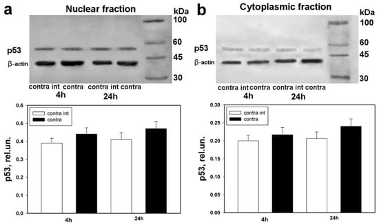 Western blot analysis. Expression of p53 in contralateral DRGs of the control group of animals, which underwent right-side sciatic-nerve transection followed by administration of physiological solution, in comparison with left-side DRGs of intact animals, to which only physiological solution was administered after 4 h and 24 h. (a) Nuclear fraction; (b) cytoplasmic fraction. One-way ANOVA. Mean ± SEM. n = 6.
