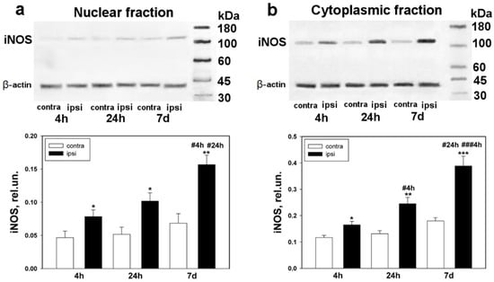 Western blot analysis. The expression of iNOS in the ipsilateral and contralateral DRGs 4 h, 24 h, and 7 days after sciatic-nerve transection. (a) Nuclear fraction; (b) cytoplasmic fraction. One-way ANOVA. Mean ± SEM. n = 6. * p < 0.05, ** p < 0.01, *** p < 0.001—ipsilateral DRG with respect to the contralateral DRG of the same animal; # p < 0.05, ### p < 0.001—ipsilateral DRG with respect to the ipsilateral DRG, at different time intervals (with respect to 4 h and 24 h).