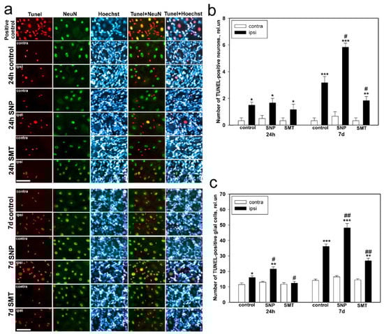 Immune fluorescent microscopy. (a) The DRG sections obtained from the control group of animals, which were treated with physiological solution, and the experimental groups of animals, which were treated with the NO donor (SNP) or the iNOS selective inhibitor (SMT), 24 h and 7 days after sciatic-nerve transection were stained with TUNEL, and the DRG sections were stained with TUNEL in the presence of benzonase nuclease (positive control). The scale section is 50 μm. (b) The number of TUNEL-positive DRG neurons in the control and experimental groups of animals, 24 h and 7 days after sciatic-nerve transection. (c) The number of TUNEL-positive glial cells in the control and experimental groups of animals, 24 h and 7 days after sciatic-nerve transection. Ipsi—the axotomized ipsilateral ganglion; contra—the contralateral ganglion; TUNEL—nuclear marker of cell apoptosis (red fluorescence); NeuN—the neuronal nuclei marker (green fluorescence); TUNEL + NeuN and TUNEL + Hoechst—overlap; Hoechst—fluorescence of the Hoechst 33342, which allows visualization of both neural and glial cell nuclei. One-way ANOVA. Mean ± SEM. n = 6. * p < 0.05, ** p < 0.01, *** p < 0.001—ipsilateral DRG with respect to the contralateral DRG of the same animal; # p < 0.05, ## p < 0.01—ipsilateral DRG with respect to the ipsilateral DRG of the control group animal, within the framework of the same time interval after axotomy.