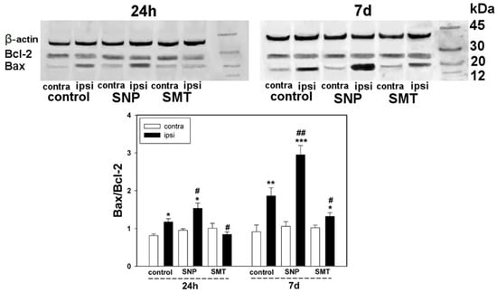 Inhibition of iNOS with SMT revealed a cytoprotector effect, which manifested as a decrease in proapoptotic activity after the trauma. It was shown that the Bax–Bcl-2 index decreased in ipsilateral DRGs, with respect to the ipsilateral DRGs of the control animals, by 33% (one-way ANOVA with a Dunnett’s post hoc test, p < 0.05, F1,10 = 9.372, Shapiro–Wilk test p = 0.309, Brown–Forsythe test p = 0.754) and 27% (one-way ANOVA with a Dunnett’s post hoc test, p < 0.05, F1,10 = 5.236, Shapiro–Wilk test p = 0.411, Brown–Forsythe test p = 0.287), after 24 h and 7 days, respectively (Figure 6). It is noteworthy that changes in the Bax–Bcl-2 ratio in injured ganglia was mostly due to the increase in the level of Bax rather than decrease in the level of Bcl-2.