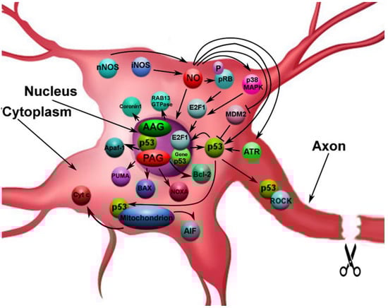 Mechanisms of apoptotic death of neurons may be achieved through the satellite glia, which is activated by inducible hyperproduction of NO. Activation of phagocytic NADPH-oxidase and expression of iNOS in glial cells lead to apoptosis via the production of ONOO−. On the other hand, the NO, which is produced by iNOS, induces neural-cell death via the inhibition of cytochrome oxidase [12]. Moreover, neurons and glial cells may undergo apoptosis due to the activation of p53-mitochondrial mechanism. Our studies showed activation of the p53 signaling pathway in neurons and glial cells of both vertebrate and invertebrate animals in response to the damage of axons [28,29]. In turn, p53 and NF-κB regulate each other either positively or negatively, depending on the intracellular conditions [71]. The NF-κB may, in turn, upregulate the iNOS (Figure 7) [47,72].