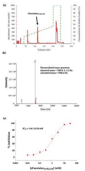 rFasxiatorN17R, L19E was overexpressed as an insoluble protein in the inclusion bodies (Figure 1) despite the use of SHuffle T7 E. coli cells, which constitutively express the disulfide bond isomerase in order to promote the formation of disulfide bonds with correctly paired cysteines. Therefore, we optimized our earlier protocol for the purification and on-column refolding of rFasxiatorN17R, L19E from inclusion bodies [30]. For an inclusion body pellet obtained from a 1L culture, the sample yield after Ni-NTA elution was low, at approximately 0.95 mg. The 6× -His tag was successfully cleaved from the expressed rFasxiatorN17R, L19E using thrombin after elution from the Ni-NTA column, as shown in Figure 1b. rFasxiatorN17R, L19E was further purified to homogeneity using RP-HPLC after affinity purification and his tag cleavage, eluting at approximately 30% buffer B (Figure 2a). Our RP-HPLC and ESI-MS data show the successful purification of rFasxiatorN17R, L19E, with the expected mass of 7585.8 kDa (Figure 2b). The amidolytic activity of FXIa on the chromogenic substrate S-2366 was inhibited by rFasxiatorN17R, L19E in a dose-dependent manner. The IC50 calculated from the dose–response curve is 1.44 0.24 nM (Figure 2c), which is similar to the previously reported value of 1.26 nM [30].