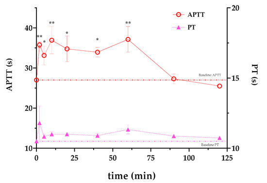 Time course anticoagulant effect of rFasxiatorN17R, L19E in rats. Activated partial thromboplastin time (APTT, red open circles, left y-axis) and prothrombin time (PT, pink solid triangles, right y-axis) of rat plasma collected at 2, 5, 10, 20, 40, 60, 90, and 120 min after a single i.v. bolus injection of rFasxiatorN17R, L19E (n = 3). Baseline APTT and PT (time = 0 min) are plotted as red and pink dotted lines, respectively. ** indicates that p ≤ 0.01; * indicates that p ≤ 0.05.