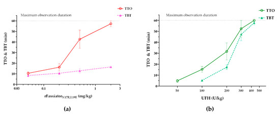 In the arterial thrombosis model, 20% FeCl3 was used to induce CAT, and rFasxiatorN17R, L19E was administrated via i.v. through the cannulation at the right femoral vein to ensure the complete delivery of the molecule. Dose–response experiments were performed in comparison with UFH, the recommended parenteral anticoagulant for clinical use in ACS and percutaneous coronary intervention (PCI) [33]. TTO in rats treated with saline was 8.0 ± 2.1 min. TTO in rats treated with rFasxiatorN17R,L19E and UFH increased with increasing dosage, demonstrating the dose-dependent efficacy of both molecules in the disease model (Figure 4). The clinically recommended dosage of UFH for PCI is 70 U/kg (i.v.), and it is translated to its animal equivalent dose of 432 U/kg for rats [36]. At this therapeutic dose, UFH achieved maximum antithrombotic efficacy in which no occlusion of the carotid artery was observed during the whole duration of observation (60 min) (Figure 4b). rFasxiatorN17R, L19E achieved the same maximum antithrombotic efficacy (i.e., equivalent to the therapeutic dose of UFH) at 2 mg/kg. (Figure 4a). In separate groups of animals treated with saline, rFasxiatorN17R, L19E, and UFH, the bleeding time after an incision was made on the tail vein also increased with increasing dosages of the respective molecules, demonstrating dose-dependent bleeding risks. TBT in rats treated with saline was 7.5 ± 0.67 min. However, the increase in TBT in rats treated with rFasxiatorN17R,L19E was demonstrably lower than those treated with UFH. At their respective therapeutic doses, TBT in rats treated with 2 mg/kg rFasxiatorN17R,L19E was 16.5 ± 1.35 min, approximately 3.5 times lower than TBT in rats treated with 432 U/kg of UFH (57.8 ± 4.4 min), suggesting a wider efficacy-to-safety index for rFasxiatorN17R,L19E than that for UFH (Figure 4).