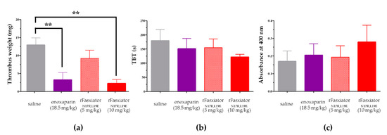 We performed IVC ligation experiments in a mouse DVT model [37]. rFasxiatorN17R, L19E was compared to LMWH enoxaparin, the recommended anticoagulant for clinical use in acute DVT. The clinically recommended dose of enoxaparin for the treatment of DVT is 1.5 mg/kg once daily s.c. or 1 mg/kg s.c. every 12 h [34,35]. We chose the once daily dose, which translates to an equivalent dose of 18.5 mg/kg in mice for the experiments [36]. In respective groups of mice, s.c. injections of saline, 5 mg/kg rFasxiatorN17R, L19E, 10 mg/kg rFasxiatorN17R, L19E, and 18.5 mg/kg enoxaparin were administrated within 15 min after the ligation of the IVC. The IVC were isolated after 24h to measure the weight of the thrombus formed. The thrombus weight in 10 mg/kg rFasxiatorN17R, L19E-treated mice (2.2 ± 1.1 mg) and enoxaparin-treated mice (3.2 ± 2.0 mg) showed a statistically significant reduction (** p ≤ 0.01) in thrombus size as compared to the saline-treated mice (13 ± 2.0 mg) (Figure 5a). The thrombus weight of mice that were treated with 5 mg/kg rFasxiatorN17R, L19E (9.2 ± 2.3 mg) is numerically lower than that of the saline-treated mice, although the difference is not statistically significant (Figure 5a). To assess the effect of rFasxiatorN17R, L19E on bleeding in mice, tails were transected before the procedure to isolate the IVC (24 h after receiving respective drug treatments), and the bleeding time was recorded. The blood was collected and used to measure the hemoglobin level as an approximation to the volume of blood loss. No statistical difference was found between the doses of rFasxiatorN17R, L19E, the enoxaparin-treated group, and the saline-treated group for both TBT and absorbance in the hemoglobin assay (Figure 5b,c). Although we did not detect statistical significance in the hemoglobin level across all treatment groups, we observed that TBT (Figure 5b) trended directly opposite of the hemoglobin level for all groups, resulting in the lack of correlation between TBT and blood loss. However, considering the low absolute absorbance values from the readings of the hemoglobin assays (Figure 5c) and the overall lack of statistical significance, it may be premature to draw any further conclusions without additional investigations.