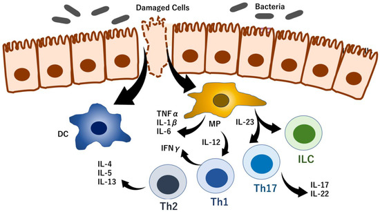 Overview of the mechanism of IBD. IBD is a complex disease that develops as result of multiple factors. Previous studies have revealed that genetic and epigenetic factors are involved in the maintenance of epithelial cell homeostasis in response to intestinal bacteria, food intake, and several irritants (e.g., cigarette smoking and alcohol intake), leading to epithelial cell damage and inflammation. Cell damage and infections stimulate dendritic cells (DC) and macrophages (MP) to secrete cytokines, including IL23, resulting in the activation of the immune response of innate lymphoid cells (ILC). The immune response can induce epithelial cell damage. In IBD, inhibition or modulation of the hyper reaction of immune cells or cytokines is a therapeutic target. In this review article, we focus RNA modification in IBD, as mentioned text, figures and tables.