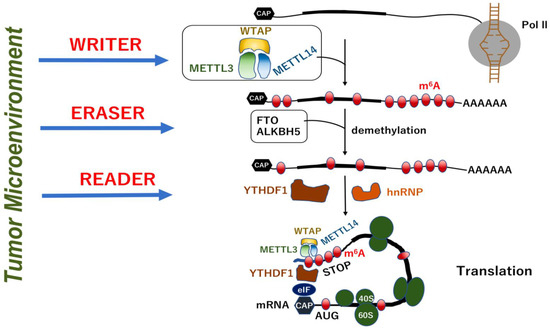 RNAs and their related molecules in human diseases. RNA polymerase-dependent synthesis and modification of mRNAs are modulated in response to the IBD microenvironment. The “writer” proteins (METTL3, METTL14, and WTAP) play a role in mRNA methylation, whereas the “eraser” proteins (FTO and ALKBH5) are involved in the removal of m6A methylation marks. These m6A marks are interpreted by “reader” proteins, such as Ythdf1, which functions in the peptide translation of mRNAs. This system plays a role in the control of peptide translation in epithelial and immune cells in IBD.
