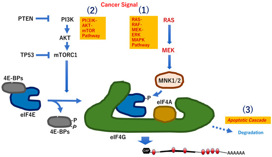 RNA modification mechanism in IBD. Generally, three mechanisms are involved in the activation of peptide translation of mRNAs. PTEN, phosphatase and tensin homolog; TP53, Tumor Protein P53; AKT, AKT serine/threonine kinase 1; mTORC1, mechanistic/mammalian target of rapamycin complex 1; eIF4E, eukaryotic translation initiation factor 4E; 4EBP, eukaryotic translation initiation factor 4E binding protein; eIF4G, eukaryotic translation initiation factor 4 gamma; eIF4A, eukaryotic translation initiation factor 4A; MNK1, MAPK interacting serine/threonine kinase 1; MNK2, MAPK interacting serine/threonine kinase 2; MAPK, mitogen-activated protein kinase; ERK1, mitogen activated protein kinase 3 (MAPK3); ERK2, mitogen activated protein kinase 1 (MAPK1); MEK1, MAP2K1, mitogen-activated protein kinase kinase 1; RAS, RAS proto-oncogene, GTPase; RAF, RAF-1 proto-oncogene, serine/threonine kinase.