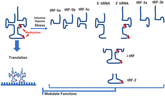 RNAs, their modification and their functions in stress. Under stress (e.g., hypoxia, viral or bacterial infections), the production of tRNA-derived stress-induced RNAs (e.g., 5′-tiRNA and 3′-tiRNA) occurs via enzymatic cleavage of tRNAs. This cleavage also leads to the generation of tRNA-derived RNA fragments (tRFs), which are involved in the modulation of translation function of standard tRNAs. Several positions in tRNAs are methylated, where such methylation modulates tRNA functions.
