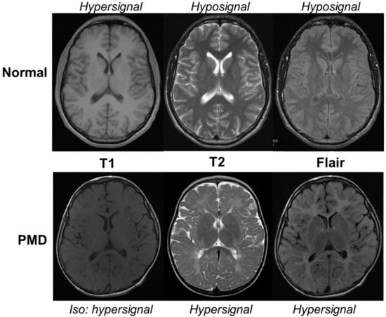 MRI of a 5-year-old Pelizaeus–Merzbacher Disease (PMD) patient in comparison with an age-matched normal boy (Normal). In physiological conditions, the myelinated white matter has a hypersignal T1, hyposignal T2, and flair when compared to gray matter. In PMD, the hypomyelinated white matter has a normal hypersignal T1 appearance contrasting with an abnormal hypersignal T2 and flair. The corpus callosum is partially myelinated with a hyposignal T2 but not with flair.