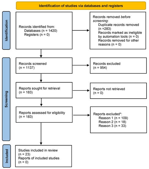 - Page, M.J.; McKenzie, J.E.; Bossuyt, P.M.; Boutron, I.; Hoffmann, T.C.; Mulrow, C.D.; Shamseer, L.; Tetzlaff, J.M.; Akl, E.A.; Brennan, S.E.; et al. The PRISMA 2020 statement: An updated guideline for reporting systematic reviews. BMJ 2021, 372, n71. [Google Scholar] [CrossRef] [PubMed]