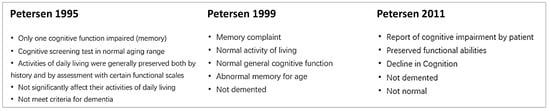 The majority of the studies included in the systematic review exclusively used Petersen’s criteria for MCI for diagnostic purposes. For the period of this review (since 1994), we note the evolution of Petersen’s criteria from 1995 to 2011 as summarized in Figure 2 [,,].