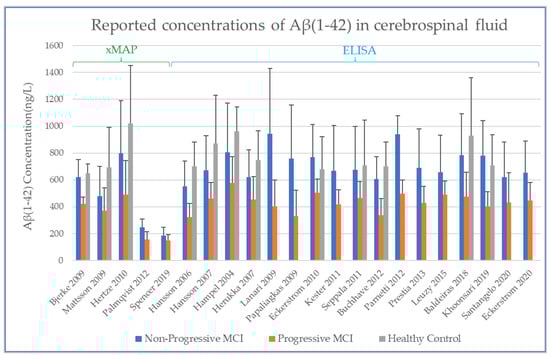 There are two major types of CSF analysis method reported in the studies identified in the systematic review. These are xMAP (multi-analyte profiling) and ELISA (enzyme linked immunosorbent assays) method. In presenting the results graphically, the findings were sorted first by analysis method (xMAP or ELISA) and then by year of publication. Both methods provide reported values as an absolute value (the mass of analyte per unit volume of CSF), and as longitudinal change is the parameter of interest, both xMAP and ELISA data are included here as reported in the source papers.