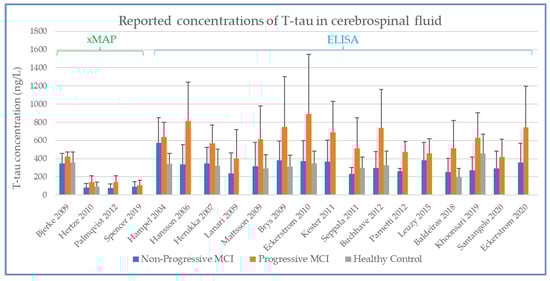 It has been suggested that abnormally high values of T-tau are caused by neuronal damage. In AD patients, cortical neuronal loss has been linked with elevated concentrations of T-tau in CSF [,,], and high CSF T-tau concentrations have been clinically correlated with rapid cognitive decline in AD and show utility as a marker of disease stage [].