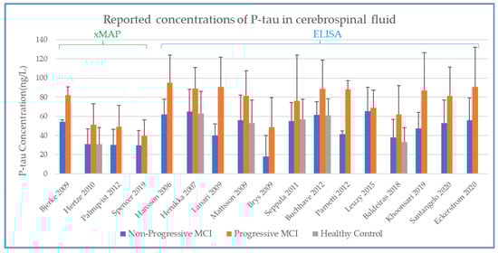 Lastly, over the period evaluated (since 1994), P-tau measures defaulted to being of P-tau181. By comparison, P-tau217 is a novel candidate biomarker, so it could not be incorporated into this analysis. Of the included studies reporting P-tau measures, 13 explicitly evaluated P-tau181, and it is an assumption (as detailed in Section 2.2) that for the four studies where this was not explicitly stated only P-tau181 residues could have been evaluated. Both P-tau181 and P-tau217 are currently being shown to have strong potential to differentiate patients with AD from other neurodegenerative disorders [] and the relationship between P-tau181, P-tau217, and amyloid burden is also being examined []. In many respects, changes in P-tau217 levels appear to parallel P-tau181 changes, and P-tau181 remains a valuable marker []; it will, however, be interesting to see how P-tau217 performs (including the Aβ1-42/P-tau217 ratio) in future meta-analyses for the purpose of predicting progression from MCI to AD.