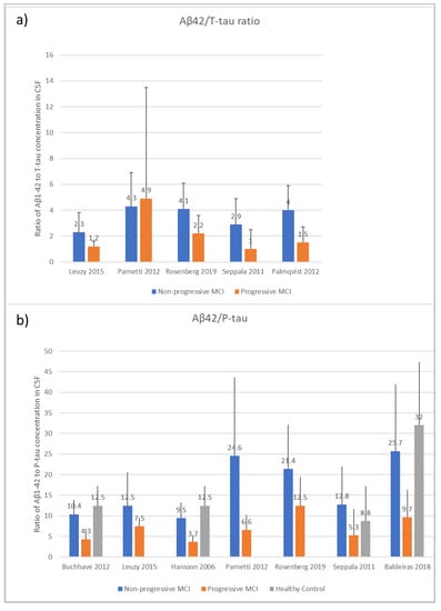 The ratio of Aβ1-42 to (a) T-tau and (b) P-tau in CSF, using data for mean and standard deviation (upper bound shown as error bar) taken directly from the sub-set of papers in the systematic review that included this information [,,,,,,,].