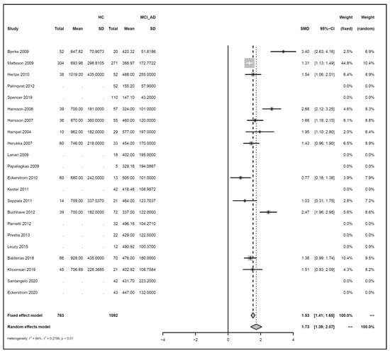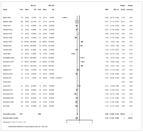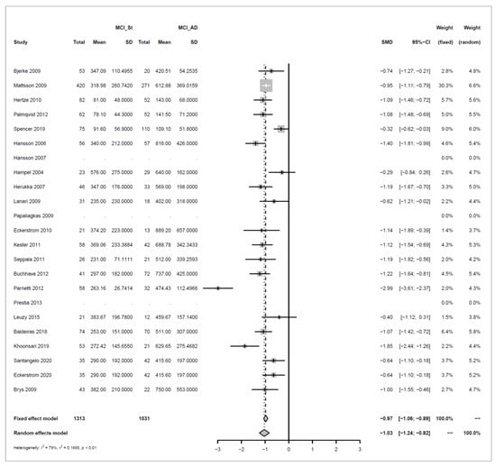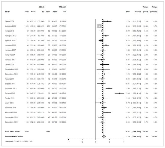 Meta-analysis of studies investigating CSF T-tau levels for non-progressive MCI (MCI_St) versus progressive MCI (MCI_AD), see Appendix A.3.1 [,,,,,,,,,,,,,,,,,,].