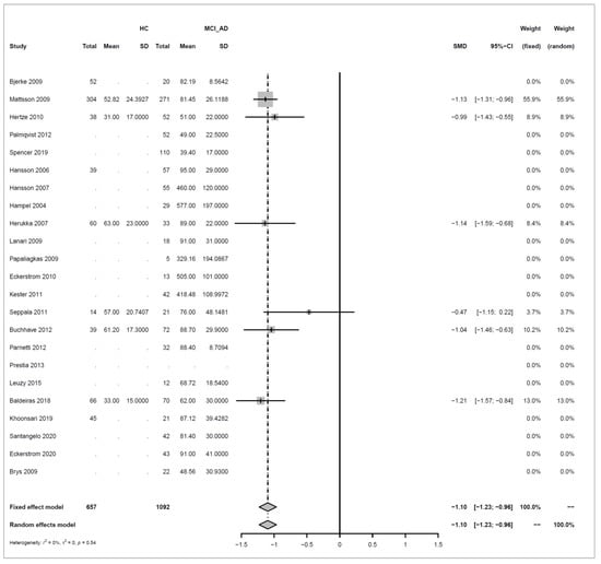 Meta analysis of studies investigating CSF Aβ1-42 levels for healthy control (HC) versus progressive MCI (MCI_AD), see Appendix A.2.2 [,,,,,,,,,,,,,,,,,,,,,].