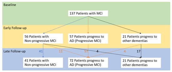 Presently, a tremendous range of methods exist to differentiate AD patients from healthy controls, comprising both physiological measurements (including imaging) and clinical screening tests. On the other hand, many of these methods lack reliability or robustness; few of them have been well-validated for their target population []. To better understand and identify AD, the timeline involved in progression from MCI to two key outcomes (either confirmed AD or a stable non-progressing form of MCI) needs to be better described. Ideally it would be possible to achieve early-stage detection as the foundation and necessary indication for early intervention, to delay, relieve, or even prevent AD in those who are pre-symptomatic.