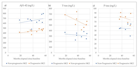 The key point here is that in Hansson’s early follow-up [], 15 patients who were previously classified as MCI according to Petersen’s criteria had been classified as having dementia in Buchhave’s late follow-up [,]. They are henceforth referred to as late-progressive-MCI patients here. Of these 15 diagnosed with dementia, 11 were confirmed with AD. From our analysis included in Table 2, it can be observed that the baseline CSF Aβ1-42 concentrations for these 15 patients were closer to the values for progressive MCI (MCI_AD) at the early follow-up, and for P-tau they were closer to non-progressive MCI (stable MCI).