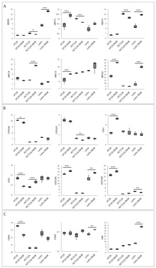 We analyzed the mRNA profiles of three CRC cell lines (HT29, LoVo, and HTC116) and their respective irinotecan (SN-38)-resistant variants using the GSE42387 database. Gene expression profiles of the parental and resistant cell lines were obtained from cells cultured for 2–3 weeks in a drug-free medium, each in triplicate (https://www.ncbi.nlm.nih.gov/geo/query/acc.cgi?acc=GSE42387 (accessed on 18 May 2022)). In our analysis, we first focused on ABC proteins, as their expression levels are considered to have a high impact on the overall SN-38 intracellular concentration and are mainly analyzed in CRC cells lines to establish the mechanism of acquired irinotecan resistance [27,29], as shown in Figure 1A. Then, we analyzed the expression levels of enzymes involved in irinotecan and SN-38 metabolism, as shown in Figure 1B. Since our previous study showed that the expression of ABC transporters in CRC was correlated to cell phenotype and shifts during ongoing EMT [18] and considering that many other reports have shown that irinotecan resistance is often related to advanced EMT, we additionally compared the expression levels of significant EMT markers, such as E-cadherin (CDH1), N-cadherin (CDH2), and vimentin (VIM) [30], as shown in Figure 1C.
