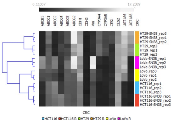 Hierarchical clustering analysis of CRC cell lines using mRNA expression profiles of irinotecan-resistance-related proteins. The expression values between SN-38-resistant variants and corresponding parental cell lines are grayscale; black represents low and white represents high expression values (6.1–17.23). A bidirectional hierarchical clustering heat map was visualized using the Orange data visualization platform.