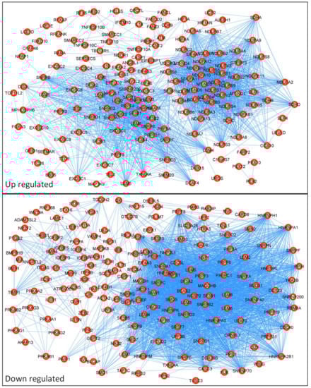 Next, we analyzed the top 250 differently expressed genes (DEGs) between the resistant and sensitive patient groups using a protein–protein interaction (PPI) network with STRING version 11.0 (https://string-db.org/ (accessed on 18 May 2022)), as shown in Figure 3. The PPI network was enhanced by known proteins that filled the gaps in proper networking, as described in [28]. The upgraded networking contained: for upregulated genes, number of nodes: 198; number of edges: 2141; average node degree: 1.6; average local clustering coefficient: 0.64; expected number of edges: 488; and PPI enrichment p-value: <1.0e-16; and for downregulated genes, number of nodes: 203; number of edges: 2989; average node degree: 29.4; avg. local clustering coefficient: 0.656; expected number of edges: and 756; PPI enrichment p-value: <1.0e-16. First, we performed a KEGG pathway analysis using the KEGG PATHWAY database (https://www.kegg.jp/kegg/pathway.html (accessed on 18 May 2022)), STRING version 11.0, and the DAVID online tool. This analysis indicated several signaling pathways that reached a false discovery rate (FDR) < 0.05 and a p < 0.05, as shown in Table 1. The top five up- and downregulated DEGs with the highest networking scores are shown in Table 2, and their respective KEGG pathways are presented in Table 3. Even though the top five DEGs presented the highest networking scores, DCAF4, QKI, and TGOLN2 showed no KEGG involvement. On the other hand, NDUAF2, SDHD, and PTGS2 were involved in many pathways. Interestingly, COX10, one of the highest networking proteins, held the number one spot among all the upregulated DEGs in the resistant patient group compared to the sensitive group. Finally, we investigated the influences of the top five DEGs on CRC patient survival using the Human Protein Atlas database (https://www.proteinatlas.org/ (accessed on 18 May 2022)) [32]. We compared the 5-year survival times of colon adenocarcinoma patients and rectum adenocarcinoma patients, as displayed in Table 4. We noticed that the 5-year survival time substantially depended on cancer location. Importantly, LSM5 and DACF4 upregulation in resistant patient samples seem to be unfavorable factors in colon adenocarcinoma patients, leading to a higher mortality rate. Surprisingly, NDUFA2, SDHD, and COX10, which were upregulated in resistant patients, positively influenced the patient survival rate. On the other hand, in rectum adenocarcinoma, the upregulation of NDUFA2 was a highly unfavorable factor, presenting a 19% 5-year survival rate in comparison to 67% for the NDUFA2 low-expression cohort. Furthermore, in the case of the top five downregulated DEGs in resistant CRC patients, a low expression level of PTGS2 was considered an unfavorable factor for both colon and rectum adenocarcinoma. In contrast, for only rectum adenocarcinoma, QKI and RBM8A were recognized as such.