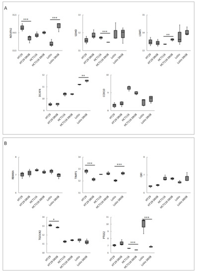 The mRNA expression levels in CRC cell lines of the 5 top networking up- (A) and down- (B) regulated DEGs from FOLFIRI-resistant patient cohort. Data were obtained using the GOE database: GSE42387 (GPL16297 Agilent-014850 Whole Human Genome Microarray 4x44K G4112F platform). Normality test (Shapiro–Wilk’s) followed by Mann–Whitney U test (for not normally distributed data) or T-test (for normally distributed data); * p > 0.05, ** p> 0.005, *** and p > 0.001.